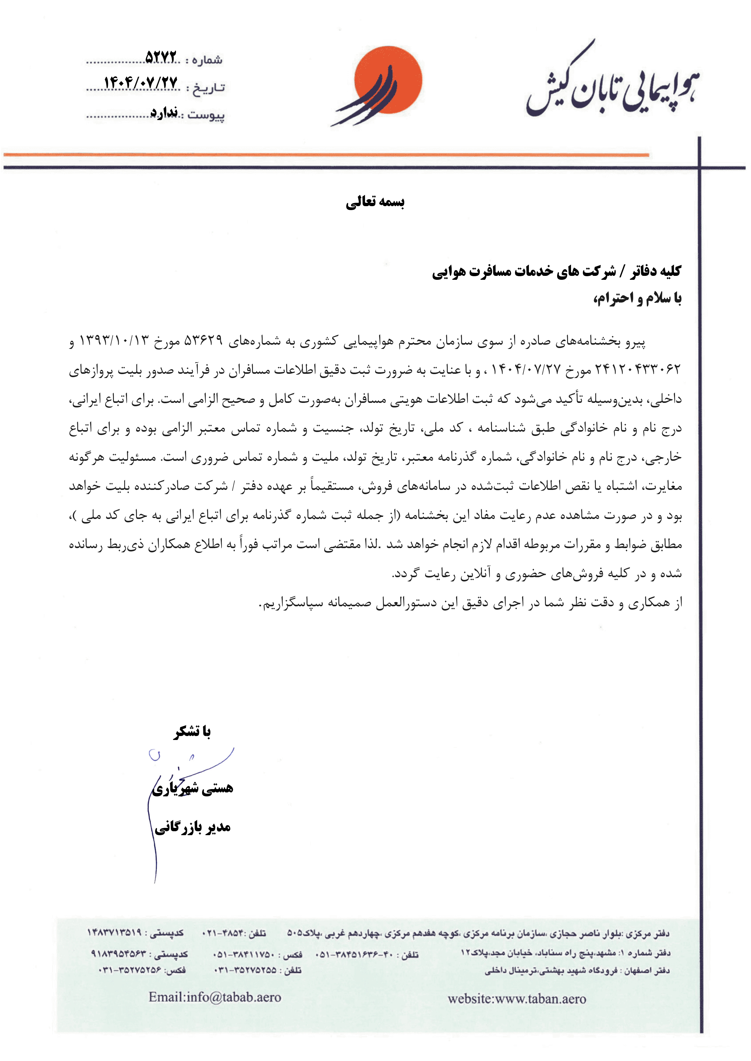 الزام ثبت دقیق اطلاعات مسافران در بلیط های داخلی